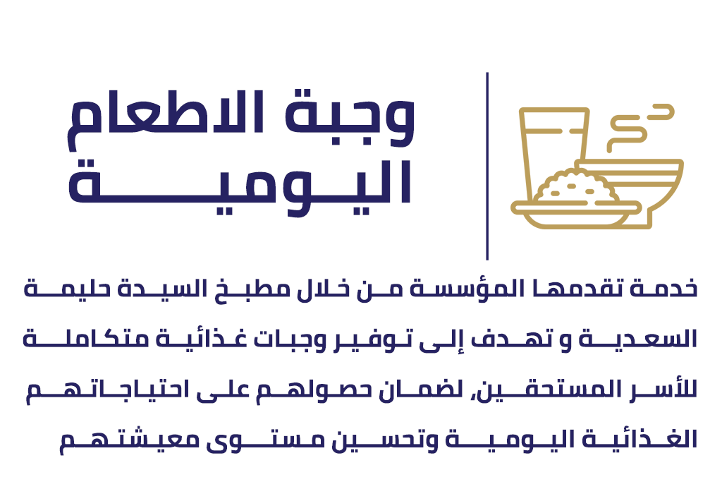 تسعى خدمـة الإطعـام اليومي إلى تقديـم وجبـات غذائيـة متكاملـة تشمل جميع العناصر الغذائيـة الأساسية، مثـل البروتين والكربـوهيـدرات والخضروات، لرفـع القيمـة الغذائيـة للوجبـات المتناولة. تستهدف هذه الخدمـة كبـار السن، المرضـى، والأسر ذات الأعـداد الكبيرة التي قد تعجـز عـن إعـداد الطعـام بشكـل يومي.