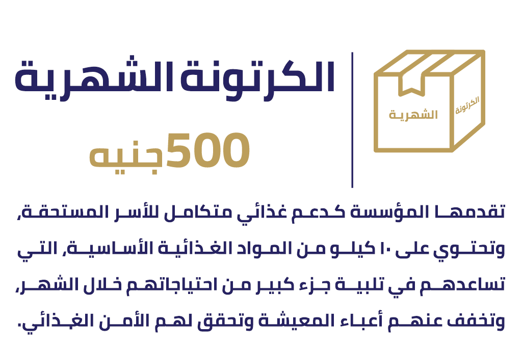 توفر خدمـة الكرتونة الشهرية مجموعة من السلع الغذائية الأساسية التي تحتاجها الأسر طوال الشهر، مما يضمن استقرار الغذاء للأسر المستحقة ويسـاعدهـا فـي تلبيـة احتيـاجـاتهـا اليـوميـة دون معـانـاة. تحتـوي الكـرتـونـة علـى مـواد غذائيـة أساسيـة ذات قيمة غذائية ضرورية لصحة أفراد الأسرة.