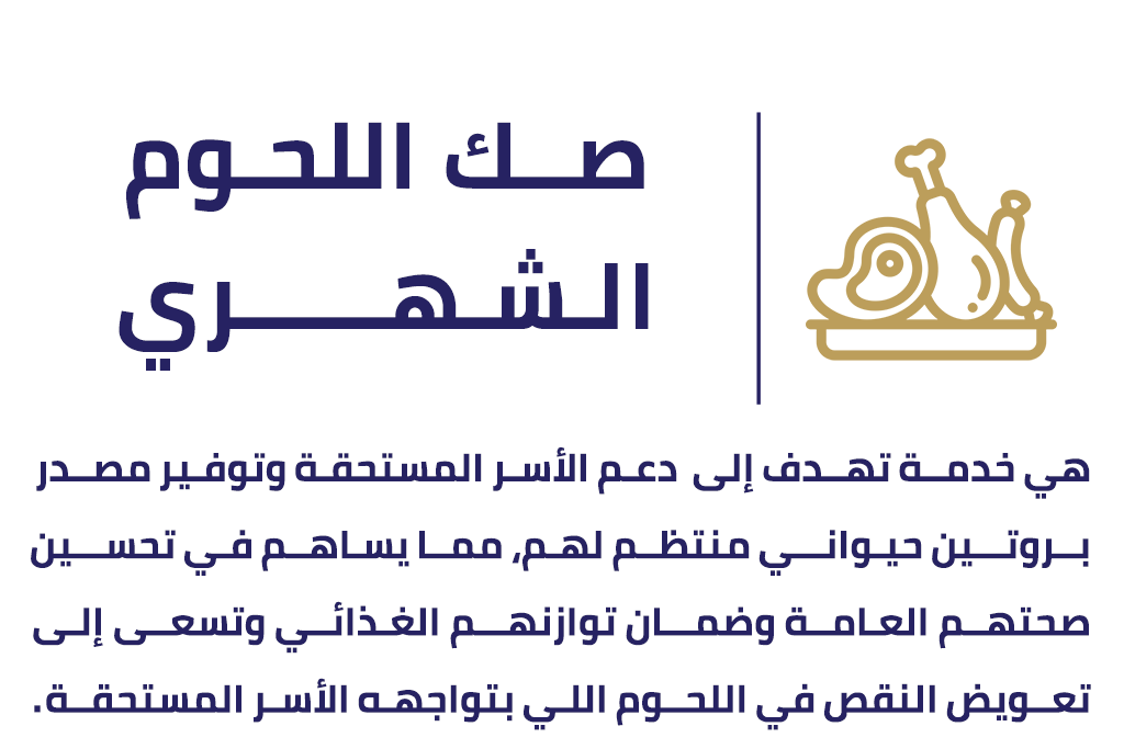 يقدم البرنــامـج خدمة صك اللحـوم الشهري، التي توفـر مصدرًا ثابتًا من البروتين الحيواني للأسر المستحقة، مما يساعد على رفع القيمة الغذائية للوجبات وتعزيز الصحة العامة للأفراد. صك اللحوم يساهم في توفير البروتين الأساسي لجميع أفراد الأسرة.