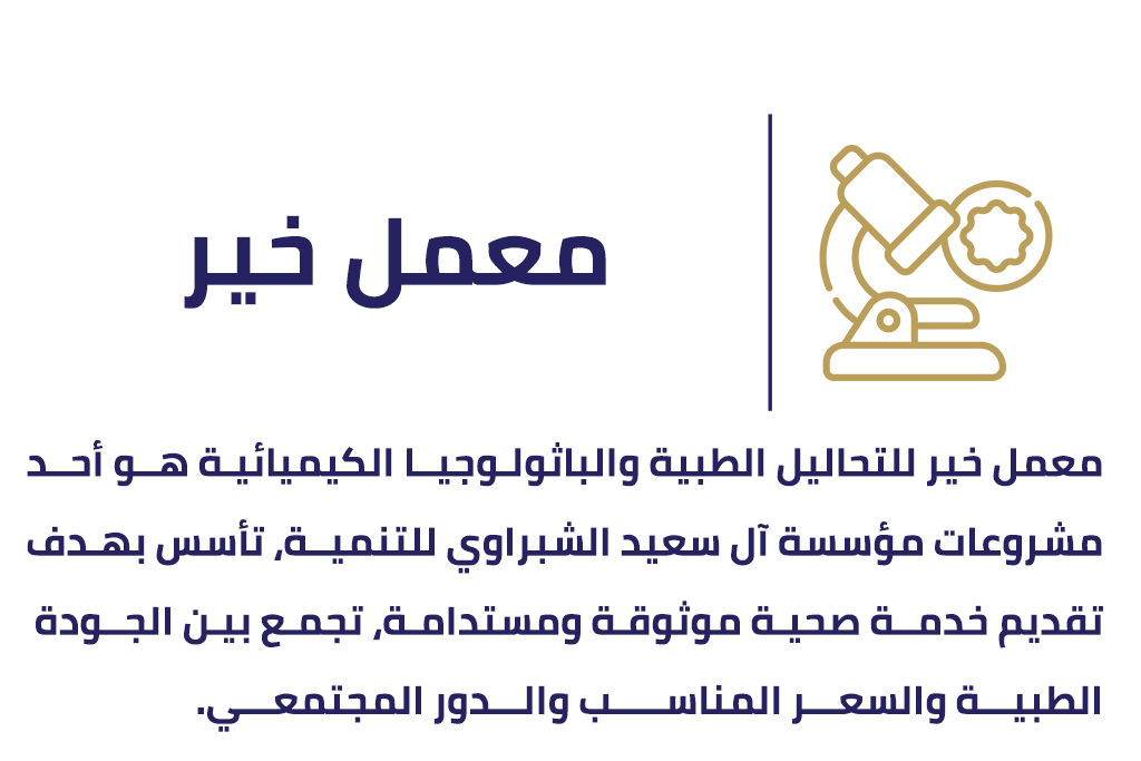يقدم معمل خير خدمة التحاليل الطبية المتنوعة بأسعار رمزية لجميع فئات المجتمع، وذلك لتوفير خدمة صحية مستدامـة وتحمـل جزء من الأعبـاء الطبيـة للأسر المستحقة. يضم المعمل مجموعة متكاملة من التحاليل الطبية الضرورية التي تلبي احتياجات الأفراد وتساهم في الحفاظ على صحتهم.